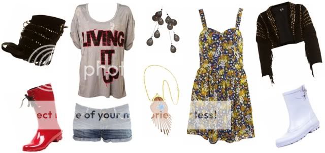 All of the above clothes are from Topshop - I can't help it, I love that shop! I've gone for two different styles, one being the shorts combo and the other using a dress to create the style. I found these cute shorter length wellies which I though would be perfect for the dress.